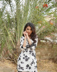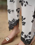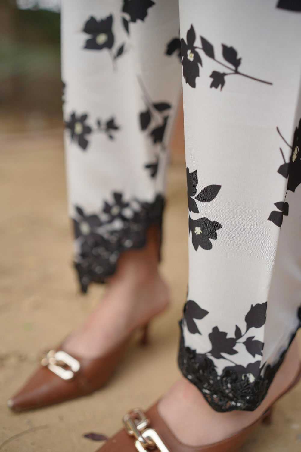 The shirt features unique tulip-cut sleeves and hem, with delicate lace detailing along the edges. A single button at the neckline adds a polished touch. Paired with trousers that mirror the tulip-cut design, this set offers a cohesive and stylish look.