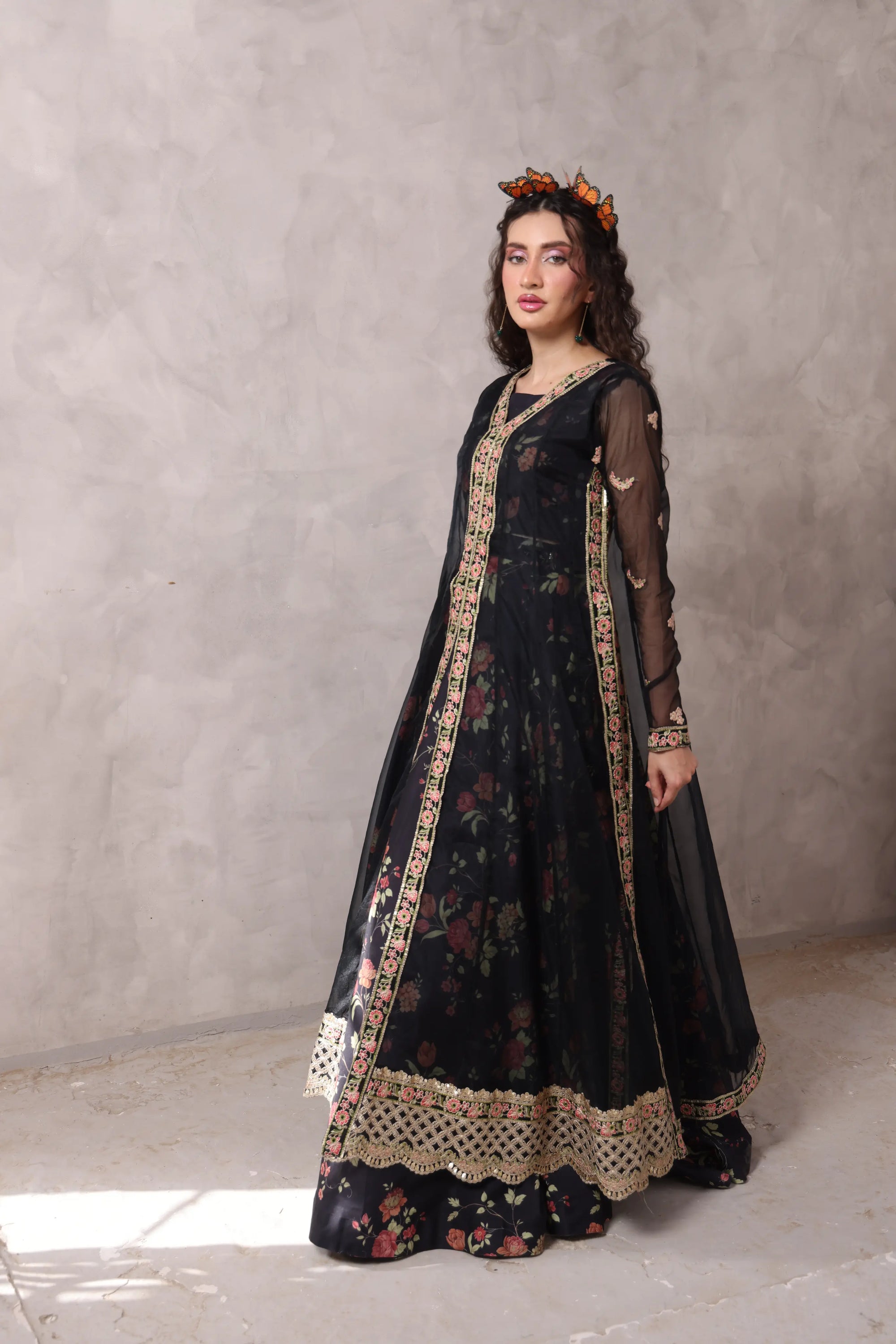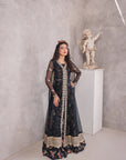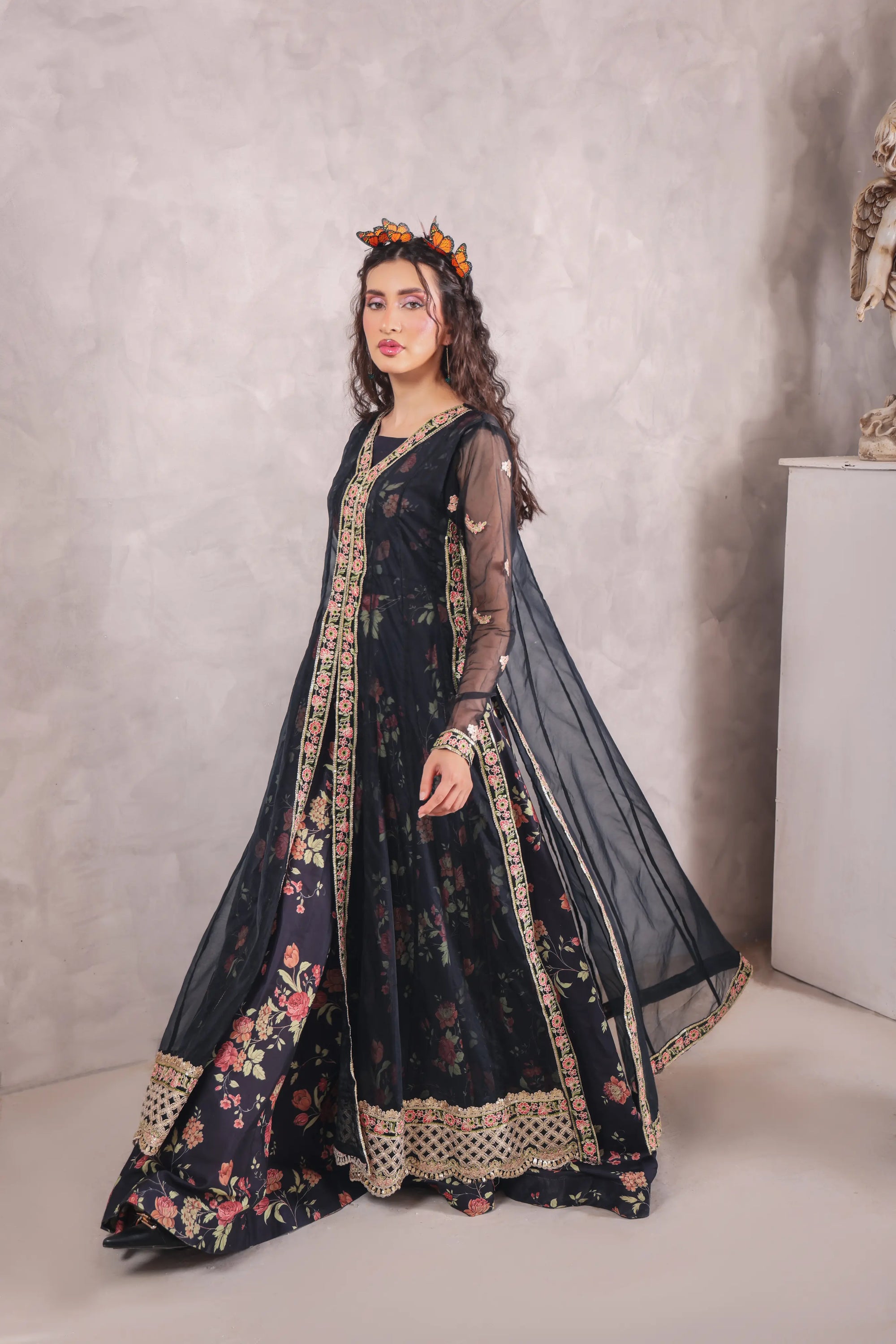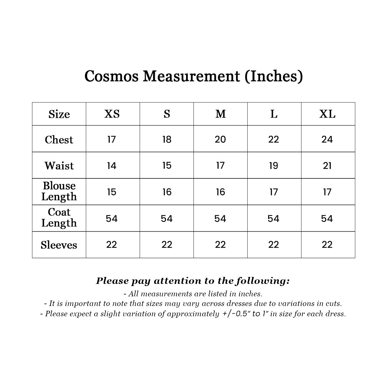 Cosmos is a 3 piece semi formal set featuring a printed blouse and lehenga paired with a stylish embroidered organza coat. With intricate thread and sequin detailing, this look is the perfect blend of tradition and modern elegance for festive occasions.