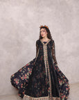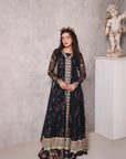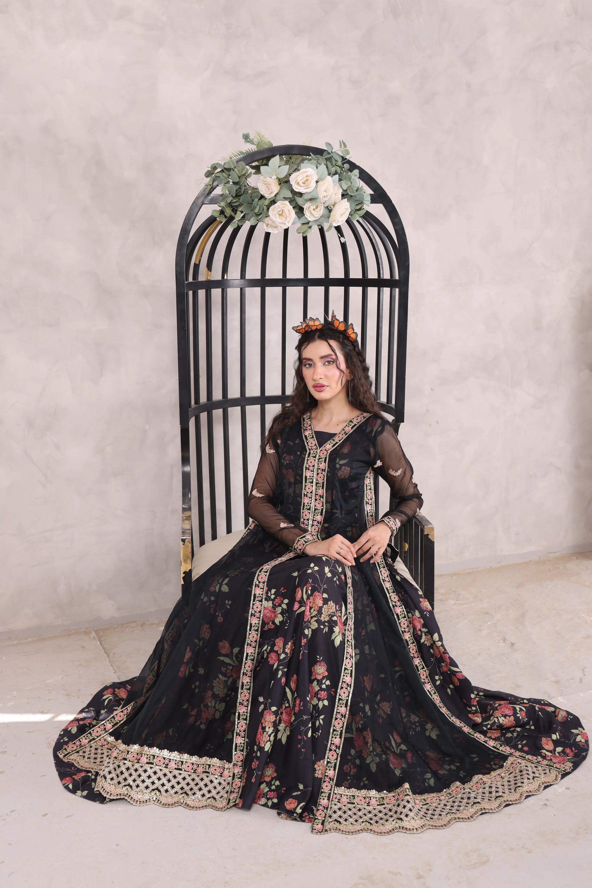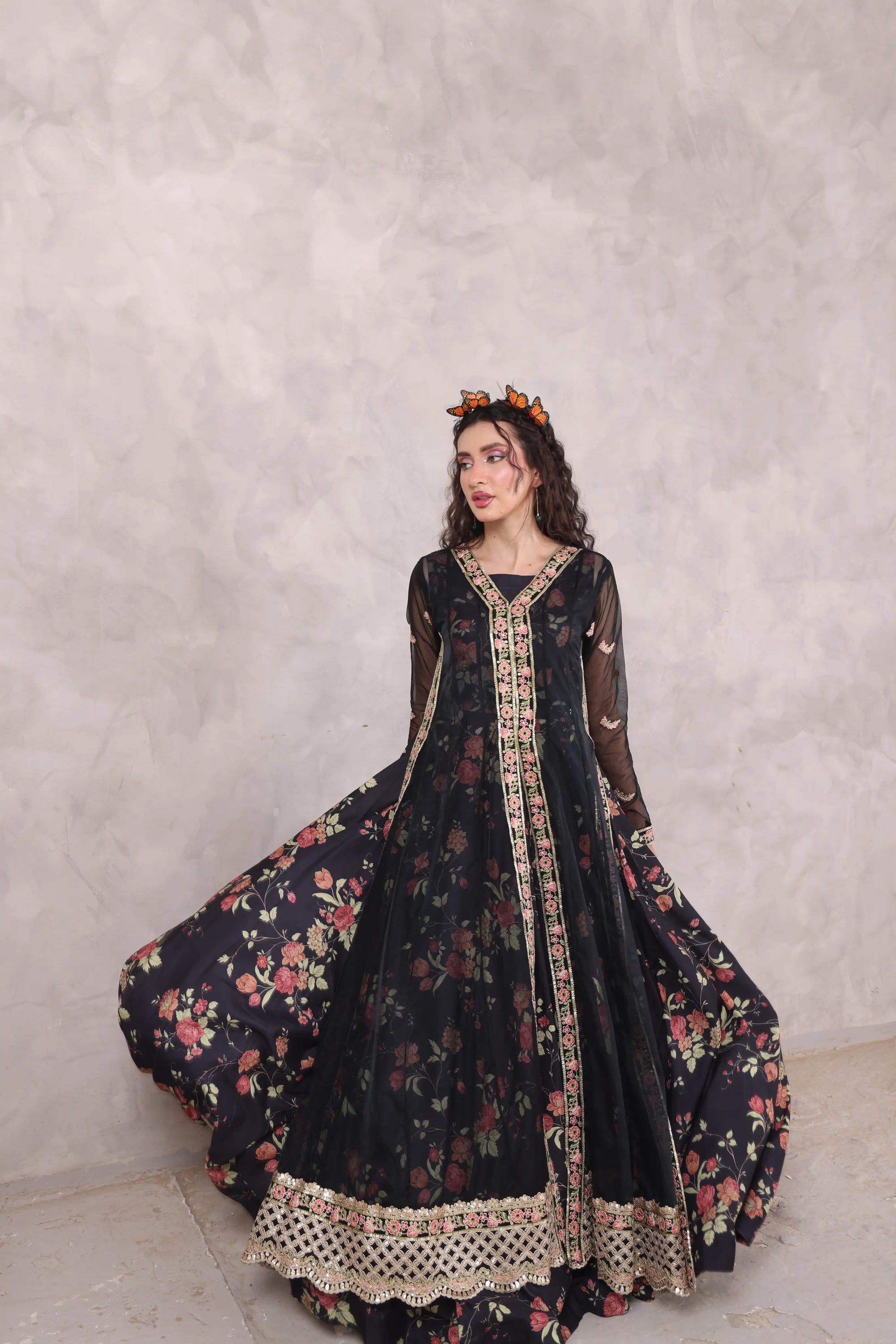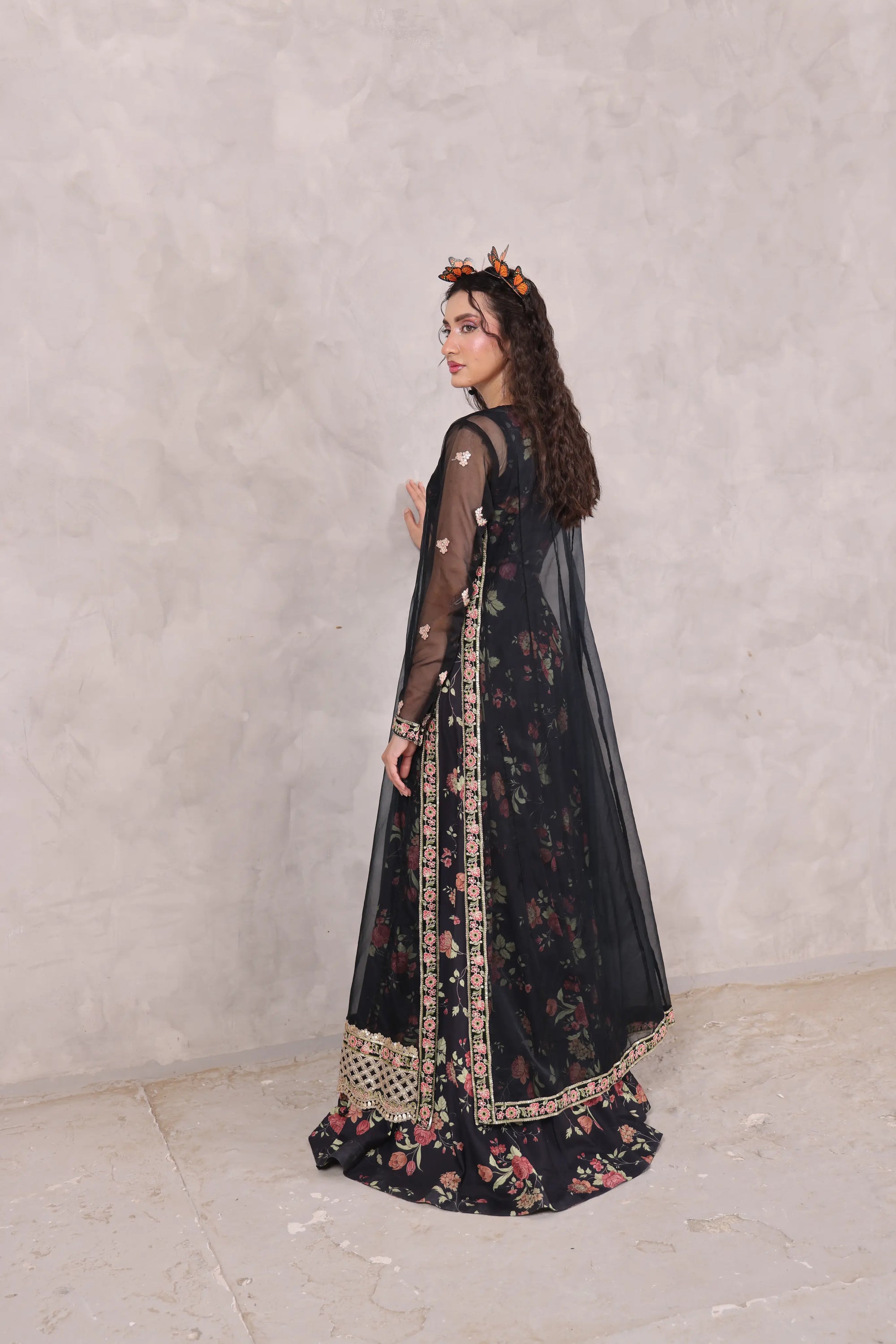 Cosmos is a 3 piece semi formal set featuring a printed blouse and lehenga paired with a stylish embroidered organza coat. With intricate thread and sequin detailing, this look is the perfect blend of tradition and modern elegance for festive occasions.
