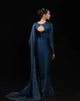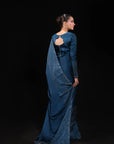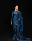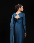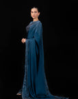 Teal Temptation channels bold elegance with a deep jewel tone palette and all over rhinestone embellishment. The luminous silk drapes like liquid over the skin, while the blouse features a contemporary cut that enhances the neckline and adds an unexpected twist at the back.