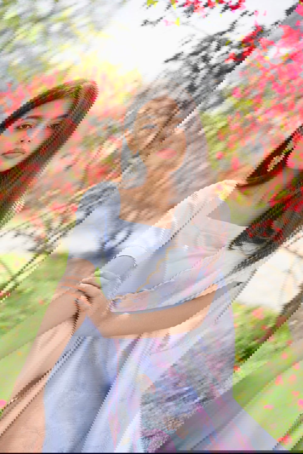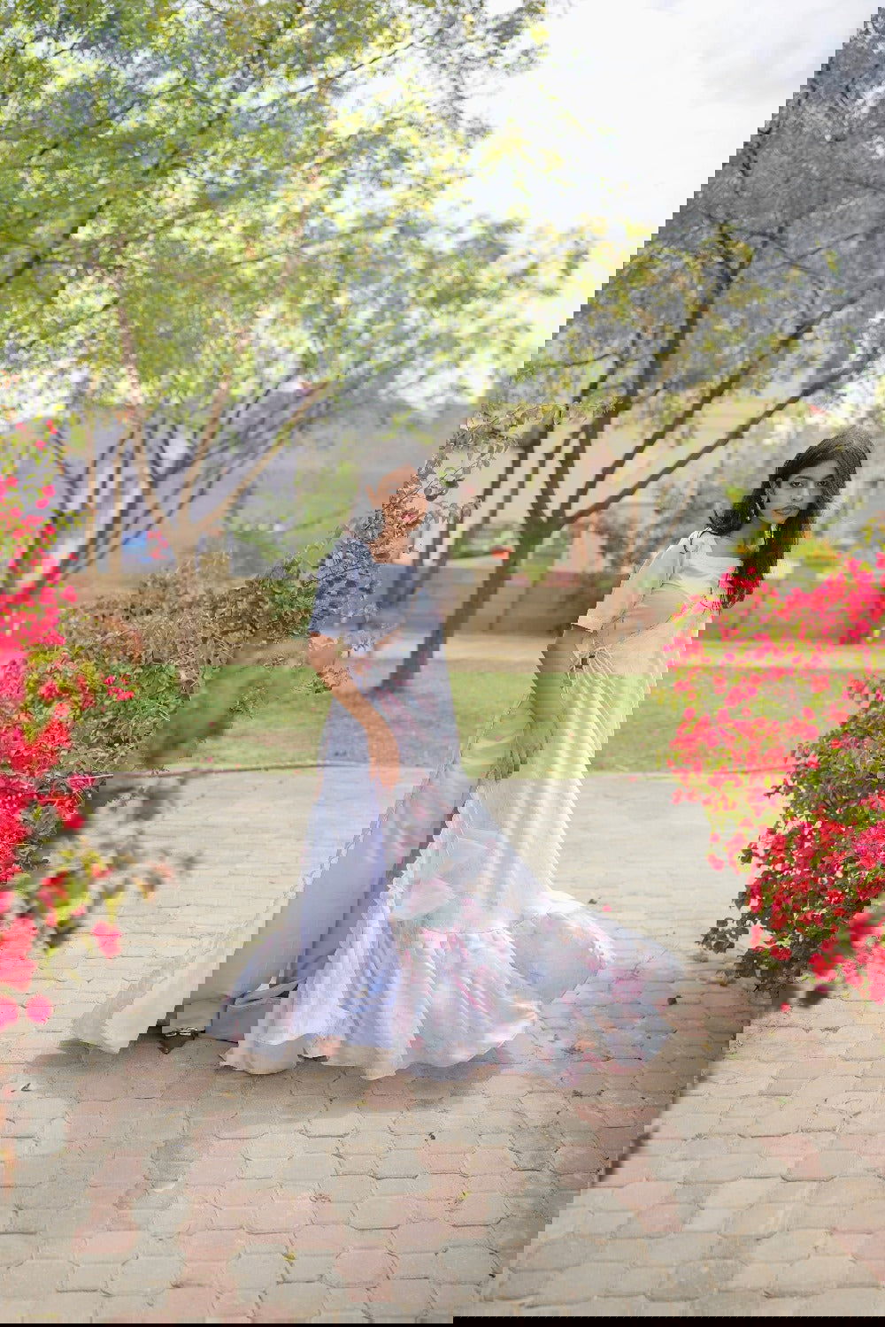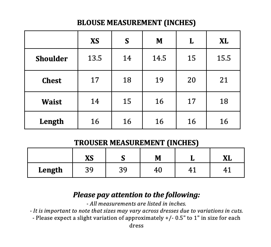 The ensemble consists of three pieces: an inner layer, drape overlay, and pocketed bell pants, offering both style and comfort. The drape overlay is adorned with a delicate scallop border, adding a touch of elegance and femininity to the ensemble. The pocketed bell pants combine functionality with fashion, offering convenience without compromising on style. With a square neckline, the inner layer complements the structured design of the ensemble, adding a modern touch to the traditional silhouette.