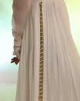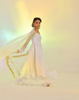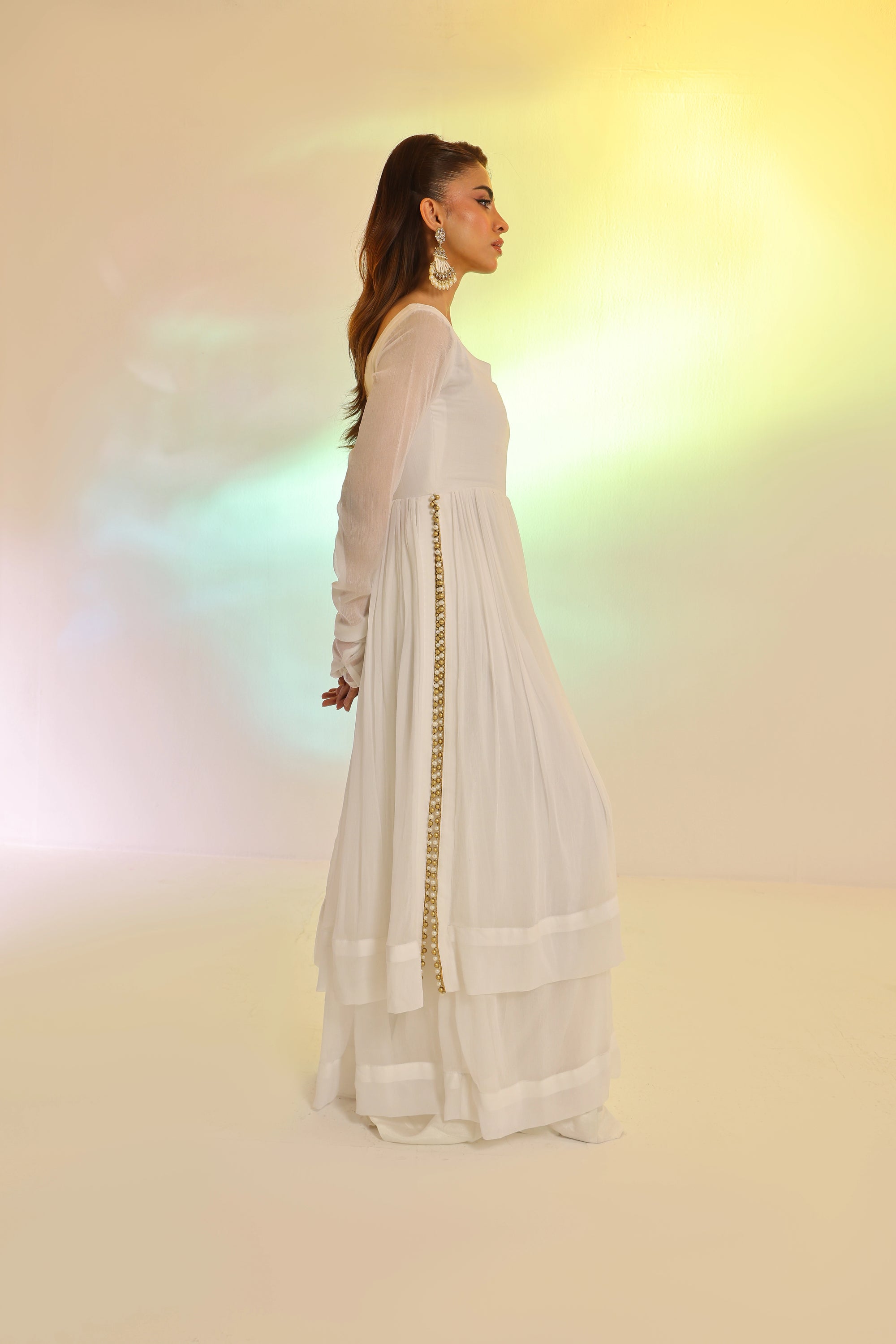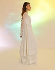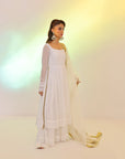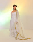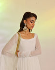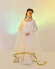 RS.3,483This Flowy set features a crinkle chiffon frock with a remarkable two-tier design that imitates a shirt and lehenga, an incredible 250+ inches of flare, made with over 10 yards of fabric. Fully lined with Malayi fabric for comfort, this frock offers a voluminous and graceful silhouette. Paired with a soft organza dupatta, featuring a four-sided lace border, this ensemble is perfect for a sophisticated and flowing look.